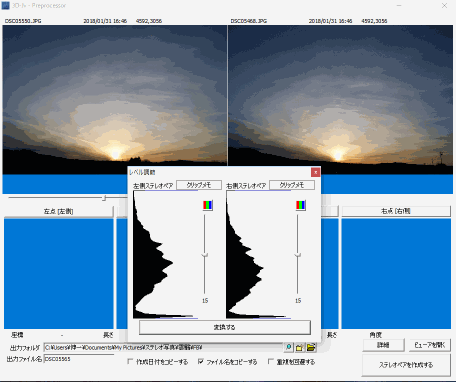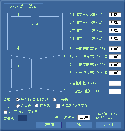 立体写真を表示して、注視点,トリミング,色調を調節して各種フォーマットの立体写真を作成します。