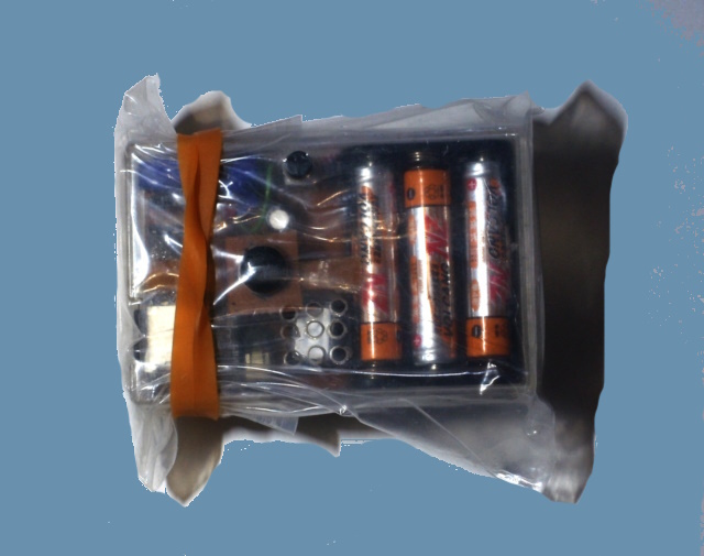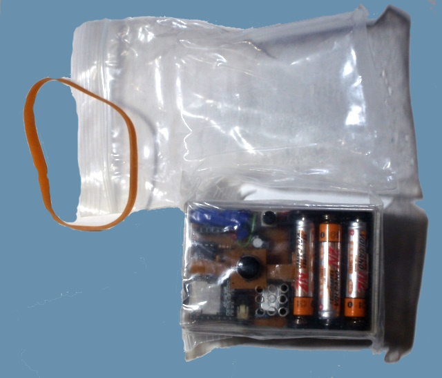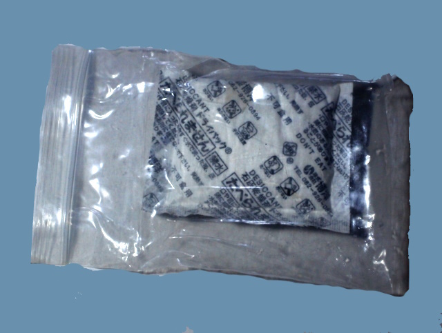 まず、85mmX120mmのチャック袋に乾燥剤と「温泉MPプレーヤー」を入れ密封します。