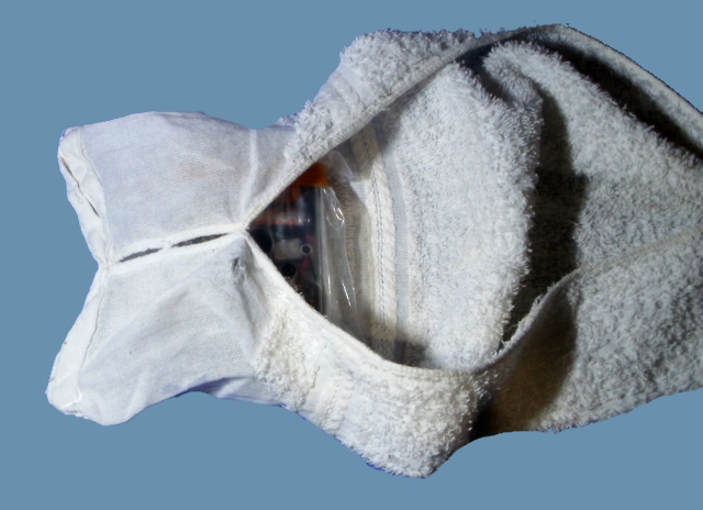 このように、タオルの端に「温泉MPプレーヤー」を収納する袋を作り、2つ目の写真のように被れるようにします。