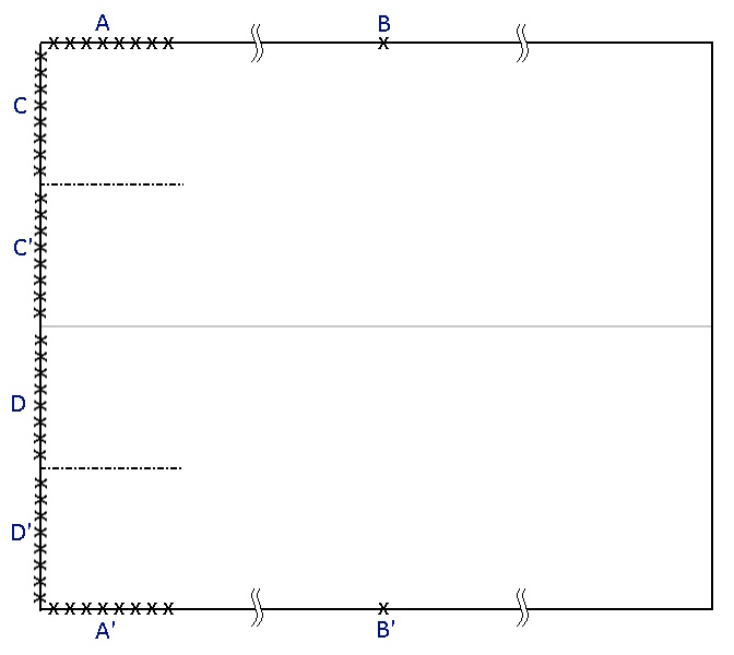 まず、AとA’の辺を縫い、筒状になったところで、袋状にするCとC’,DとD’の辺を縫います。