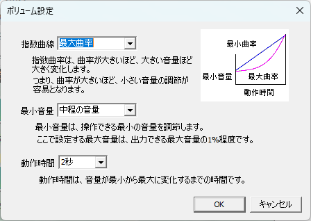 “最大曲率”,”大きい曲率”,”中程の曲率”,”小さい曲率”,”最小曲率”の中から選択します。(デフォルトは最大曲率) - 最小音量