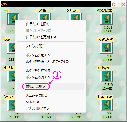 1b.exe実行で、メインウィンドウからコンテキストメニューを開き「ボリューム設定」①を開く。