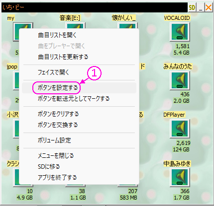 4X4(計16個)のアイコンのうち、好きなアイコンを選択し、右ボタンクリック、メニューから「ボタンを設定する」①を選択する。