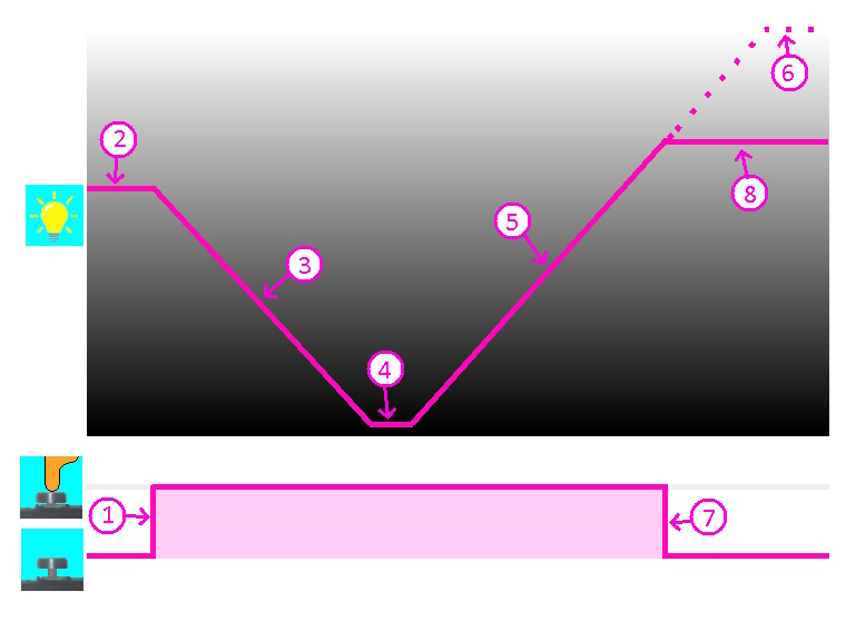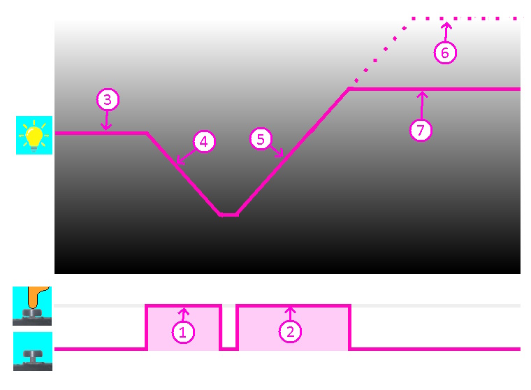 長押し②の時に、操作者が良いと感じたタイミングでボタンを離すと、変更した明るさ⑦を保持します。