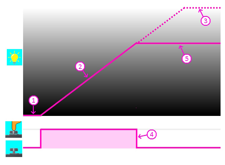 短押し①して長押し②すると、現在の明るさ③が明るい方向④にだんだん変化して、最大の明るさ⑤に達すると最大の明るさ⑤を保持します。